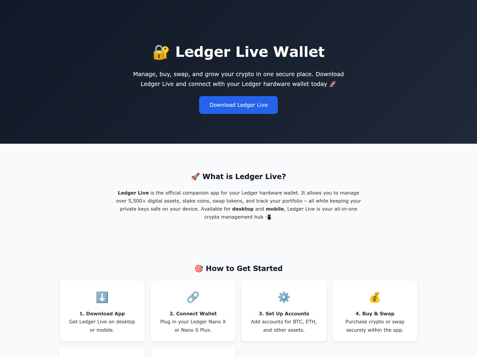 Always access Ledger through the official website. Never enter your seed phrase or private keys on any website. Use hardware wallets for additional security.