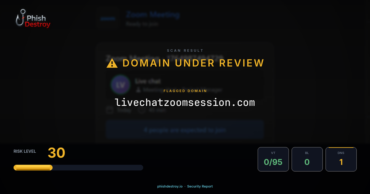 livechatzoomsession.com has been listed on PhishDestroy as a suspicious domain. Scanned by 95 security vendors — automated detections may take time to update. PhishDestroy threat analysts continue to monitor this domain.