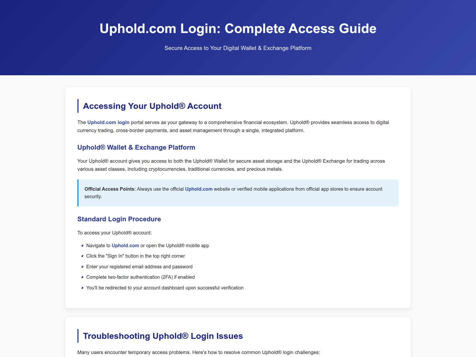 The site displays a page titled “Uphold.com Login Guide: Secure Access & Troubleshooting Solutions”.