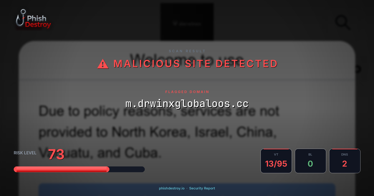 m.drwinxglobaloos.cc has been flagged by 13 security vendors as of March 16, 2026.