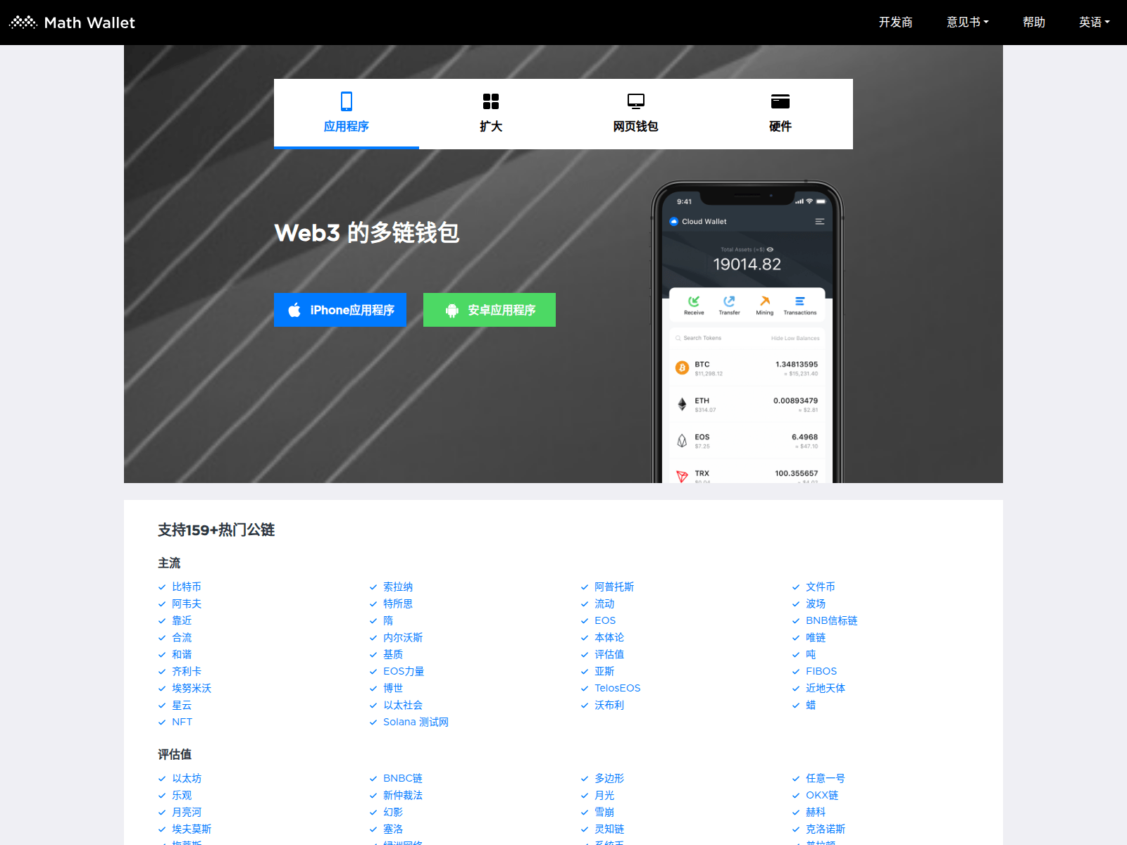 The site displays a page titled “Math Wallet,Web3 的多链钱包”.