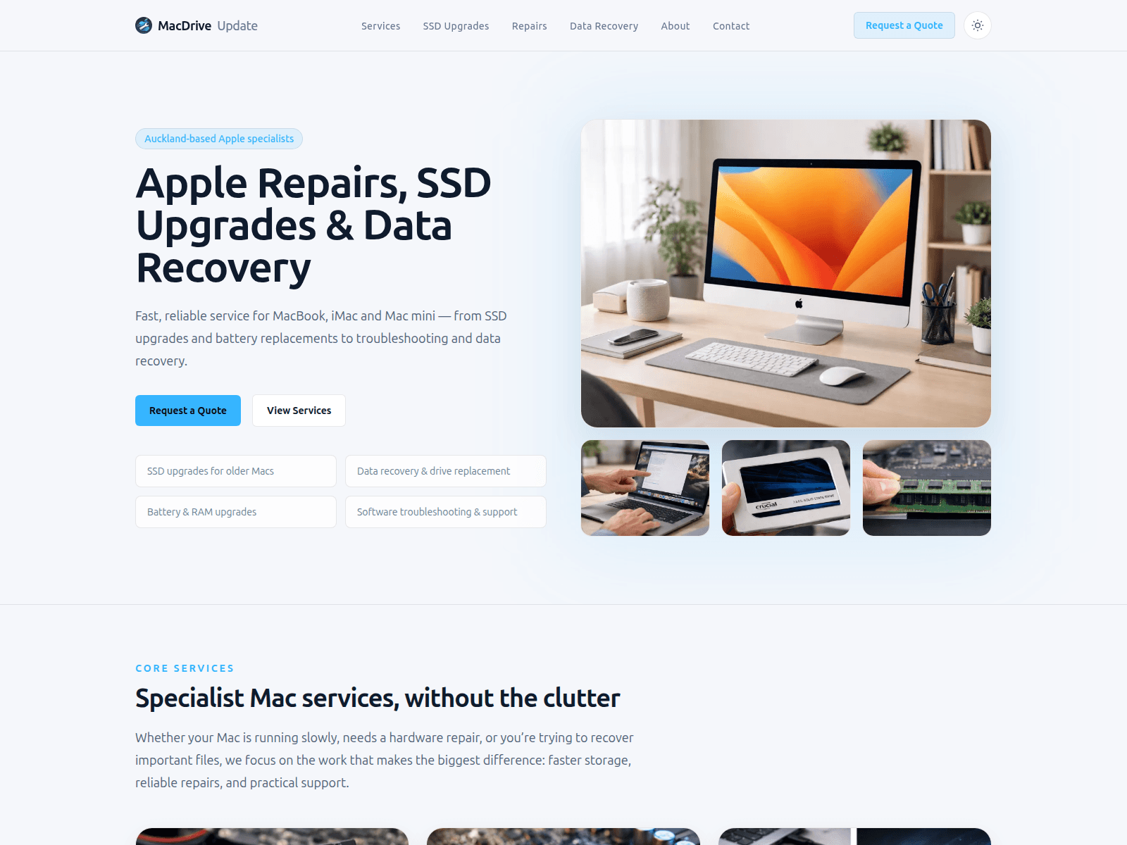 The site displays a page titled “MacDrive Update | Apple Repairs, SSD Upgrades”, which may be designed to impersonate Apple.