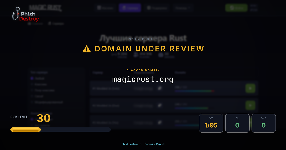 This domain security report for magicrust.org is maintained by PhishDestroy's automated threat intelligence pipeline. Our system continuously monitors this domain across 1 security vendors on VirusTotal, 1 public blocklists.