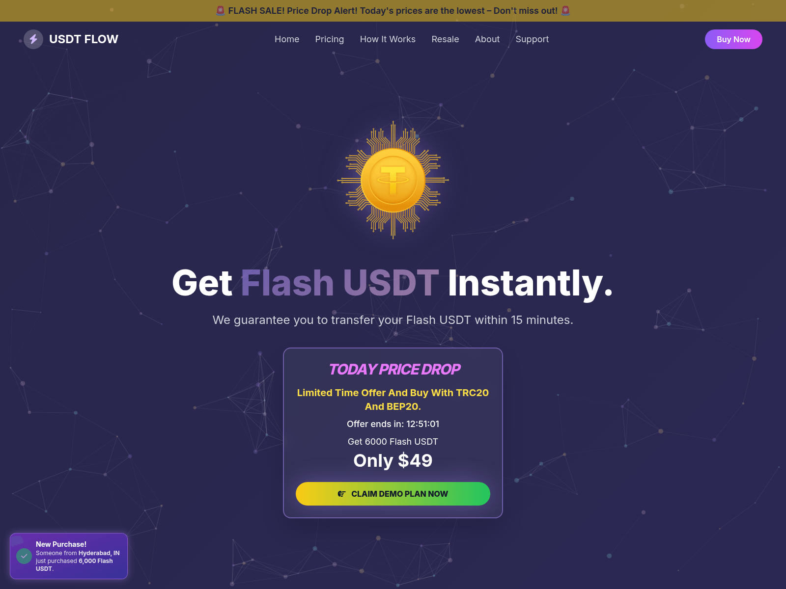 The site displays a page titled “USDT Flow | Buy With UPI and Trc20 | Instant Delivery”.