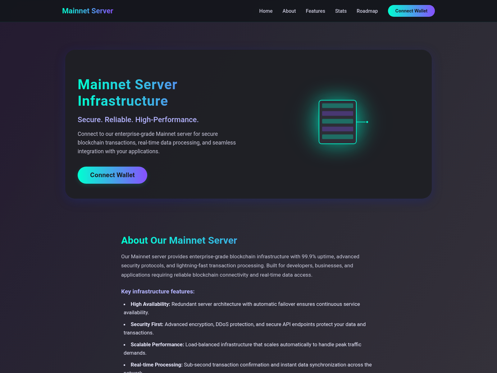 The site displays a page titled “Mainnet Server - Secure Blockchain Infrastructure”.
