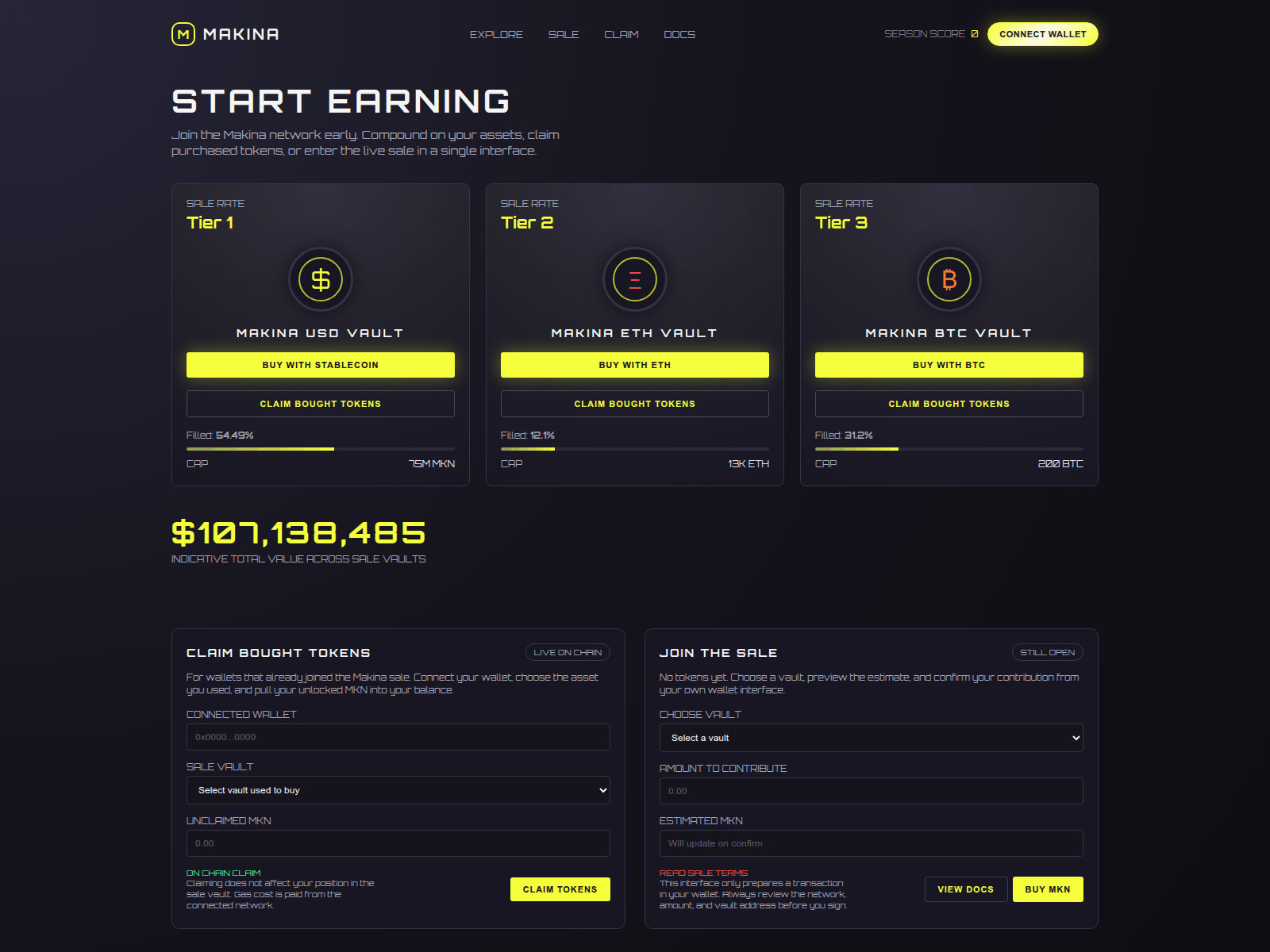 The site displays a page titled “Makina | Claim & Buy Token”, which may be designed to impersonate across.