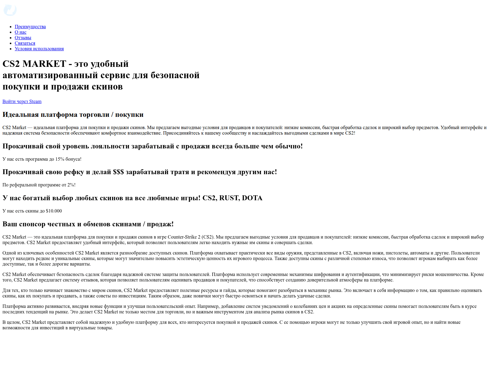 The site displays a page titled “CS MARKET - ÐокÑпайÑе ÐС:ÐÐ (CS2) пÑедмеÑÑ - ÐС ÐаÑкеє.