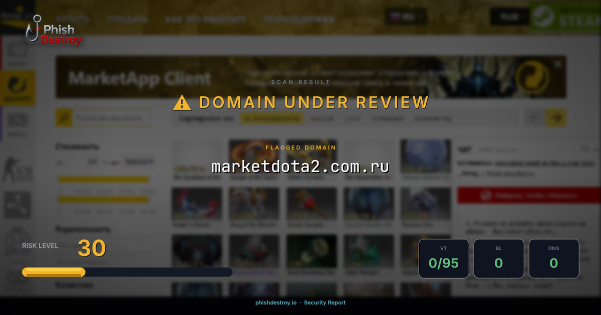 marketdota2.com.ru has been listed on PhishDestroy as a suspicious domain. Scanned by 95 security vendors — automated detections may take time to update. PhishDestroy threat analysts continue to monitor this domain.