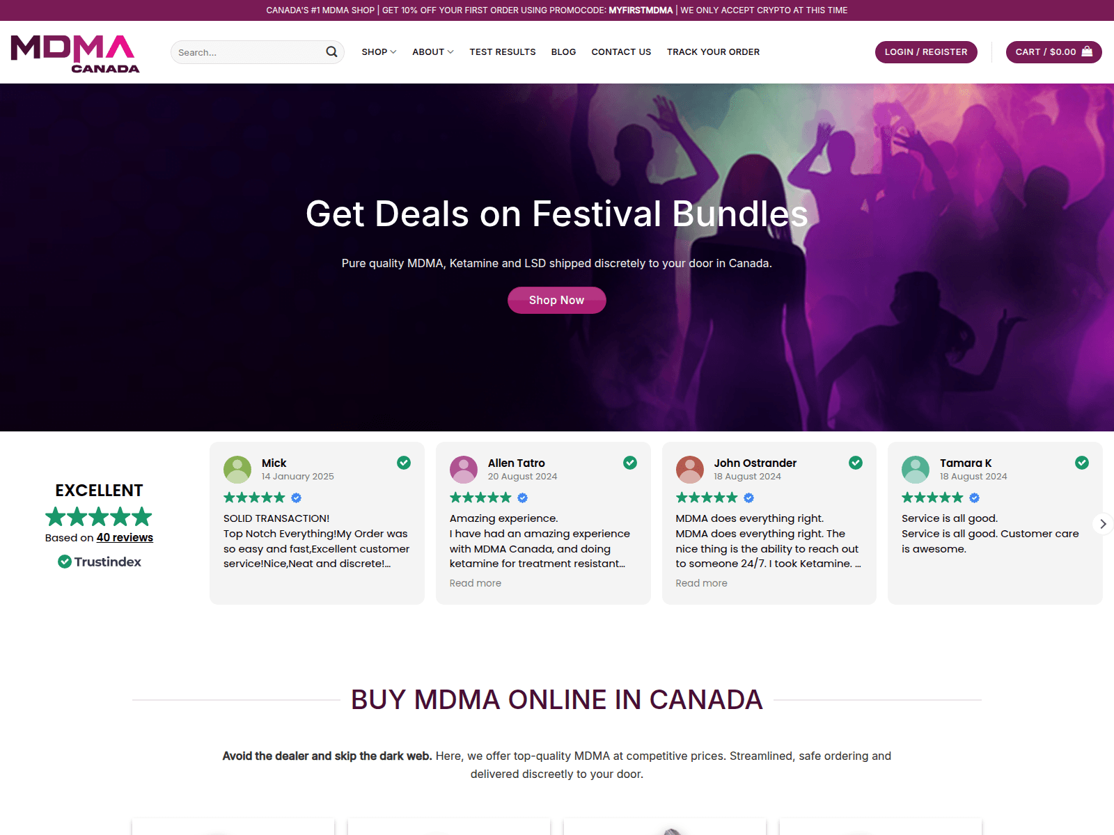 The site displays a page titled “Buy Legal MDMA In Canada - Canada’s Most Trusted MDMA Online”.