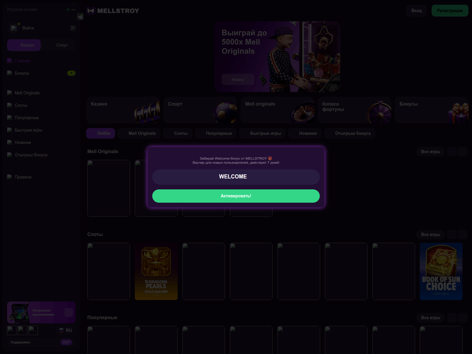 The site displays a page titled “Mellstroy — Official Online Casino”, which may be designed to impersonate Crypto Casino / Gambling.
