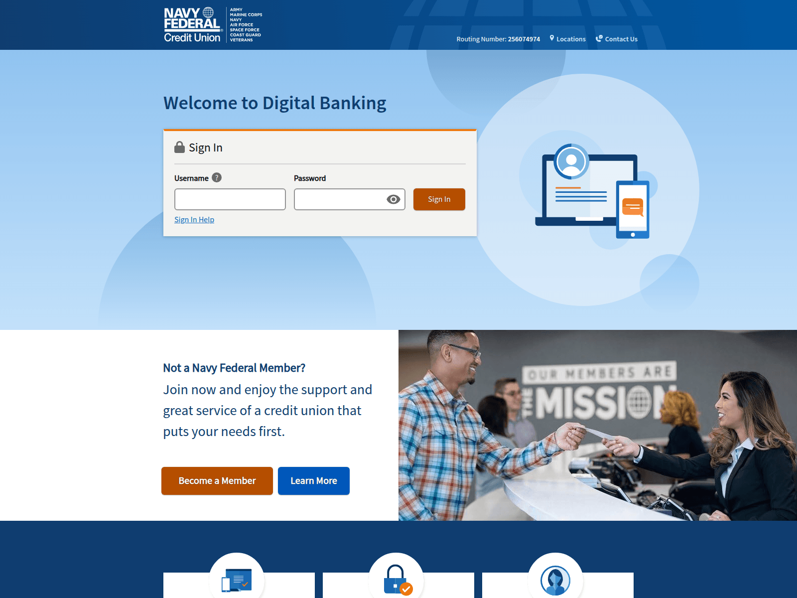 The site displays a page titled “Navy Federal Credit Union - Our Members are the Mission®”.