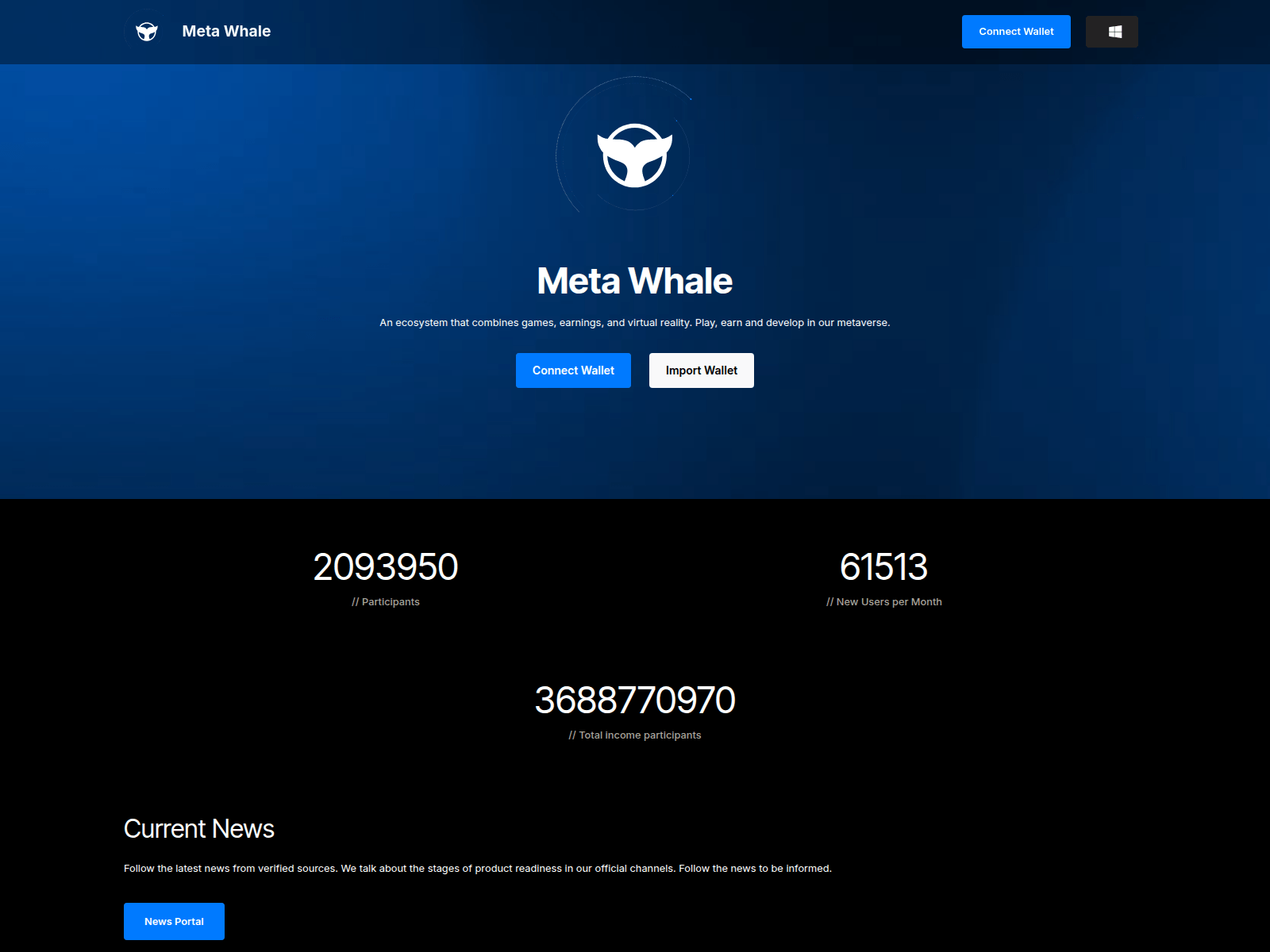The site displays a page titled “Meta Whale - Where virtuality meets reality”.