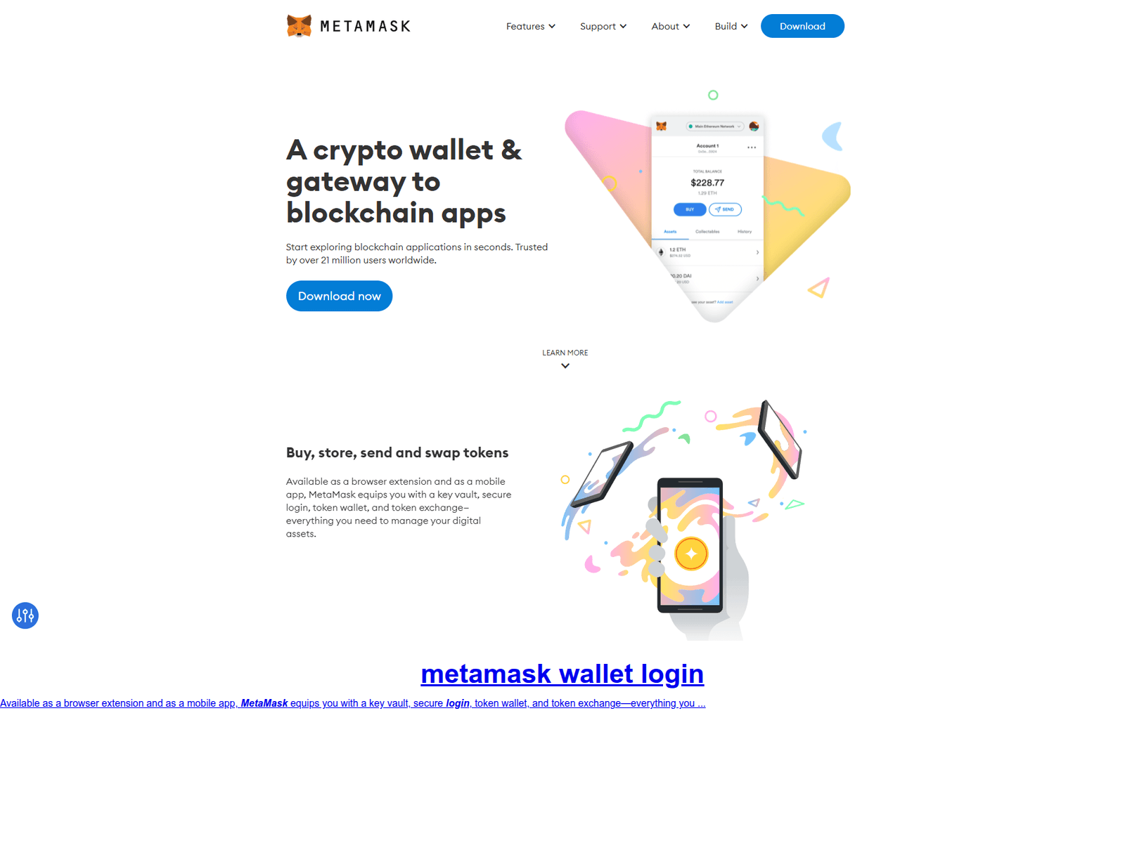 The site displays a page titled “metamask wallet login”, which may be designed to impersonate MetaMask.