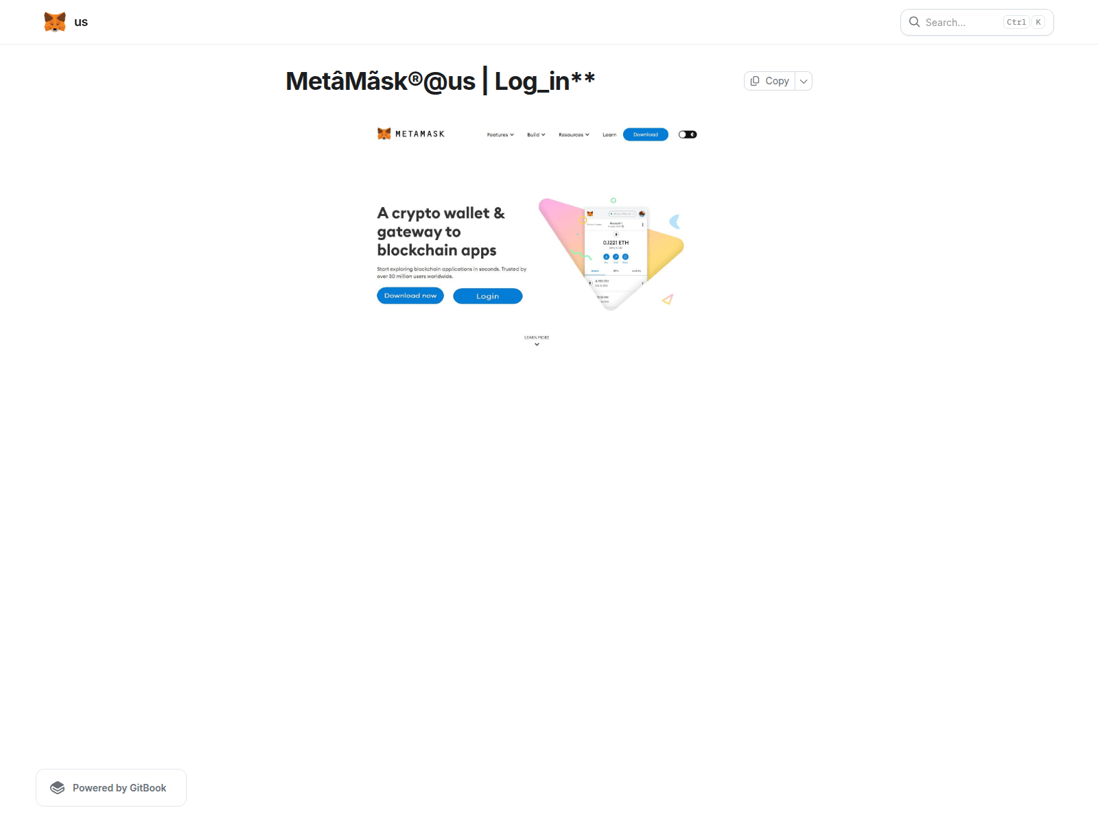 PhishDestroy has identified metamzklganl[.]gitbook[.]io as a suspicious phishing domain impersonating MetaMask, a popular cryptocurrency wallet. The page title 'MetâMãsk®@us | Log_in | us' suggests it was crafted to deceive users into divulging sensitive login credentials. Although the exact risk level remains under investigation, the domain’s behavior is consistent with generic phishing tactics aimed at credential theft.