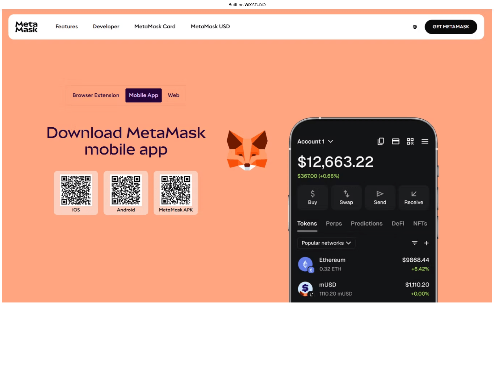 The site displays a page titled “404 Error: Page Not Found | Wix Studio”, which may be designed to impersonate MetaMask.
