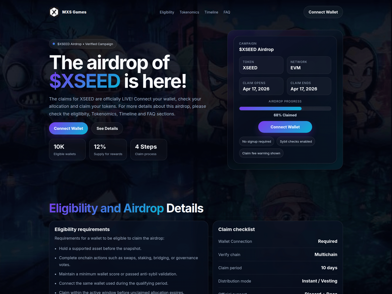 The site displays a page titled “MXS Games $XSEED Airdrop”, which may be designed to impersonate Airdrop Scam.