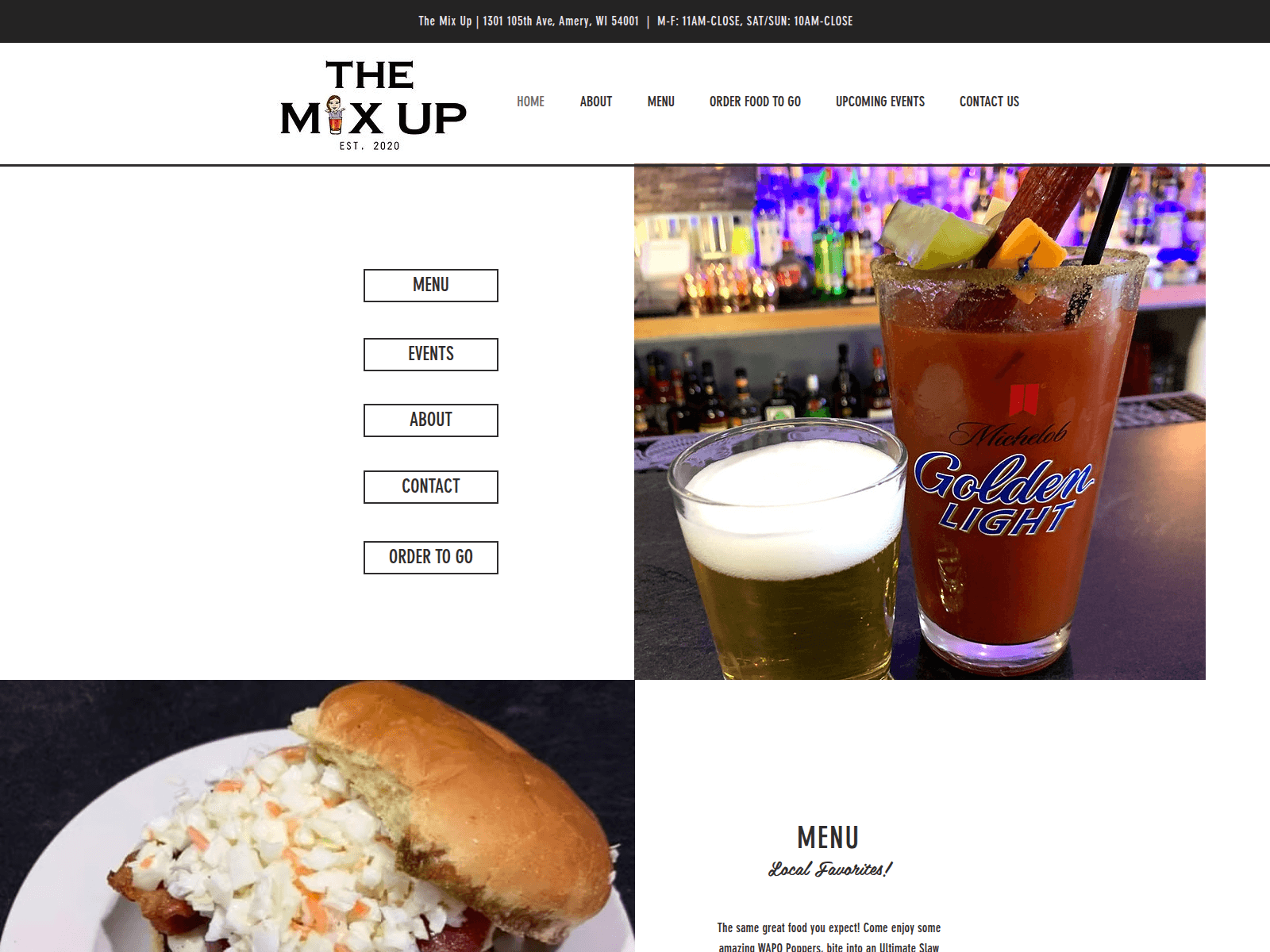 The site displays a page titled “Miki Jo's Mix Up | Bar and Restraurant | Amery, WI”.