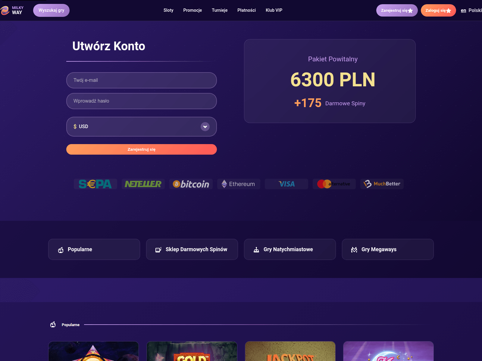 The site displays a page titled “MilkyWay Casino Polska (2026) – 20 Darmowych Spinów Bez Depozytu + Bonus 6300 PLN”.