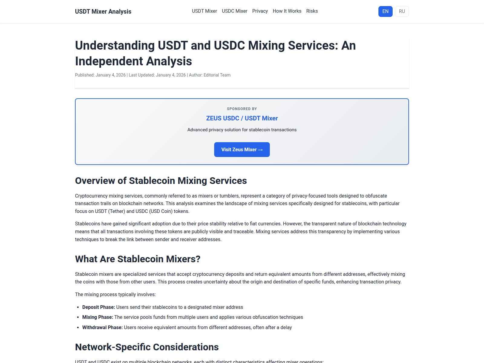 The site displays a page titled “USDT Mixer Analysis: Privacy Tools for Stablecoin Transactions”.