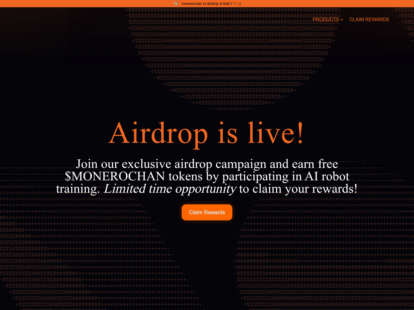The site displays a page titled “Airdrop is live l Join our exclusive airdrop campaign and earn free $MONEROCHAN tokens”, which may be designed to impersonate Airdrop Scam.