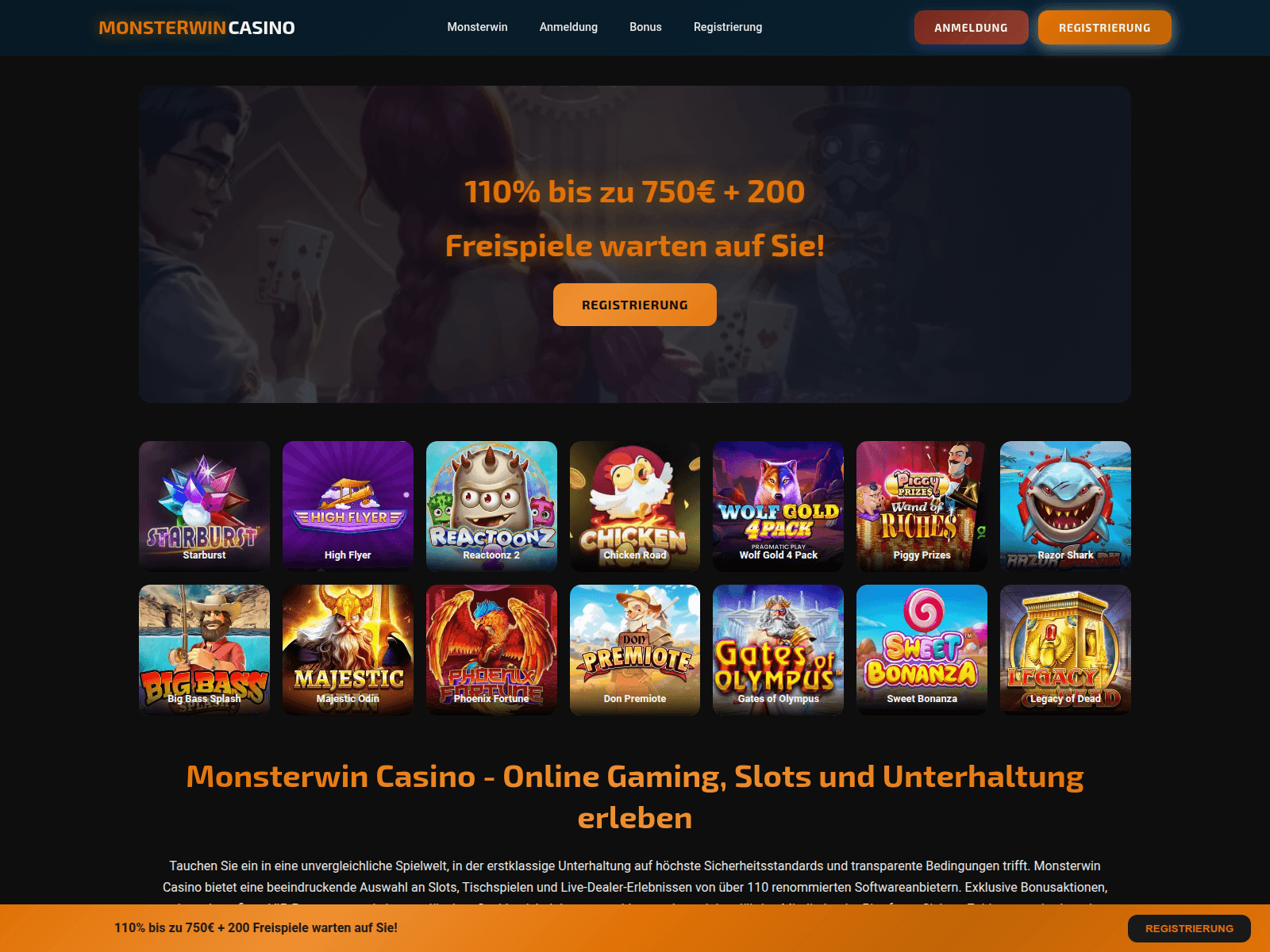The site displays a page titled “Monsterwin Casino | 13.000+ Spiele, Boni & Sicherheit”.