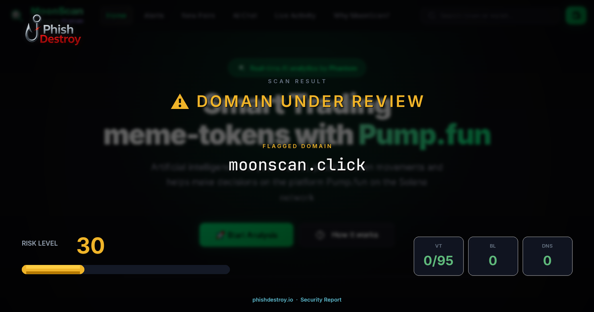 moonscan.click has been listed on PhishDestroy as a suspicious domain. Scanned by 95 security vendors — automated detections may take time to update. PhishDestroy threat analysts continue to monitor this domain.
