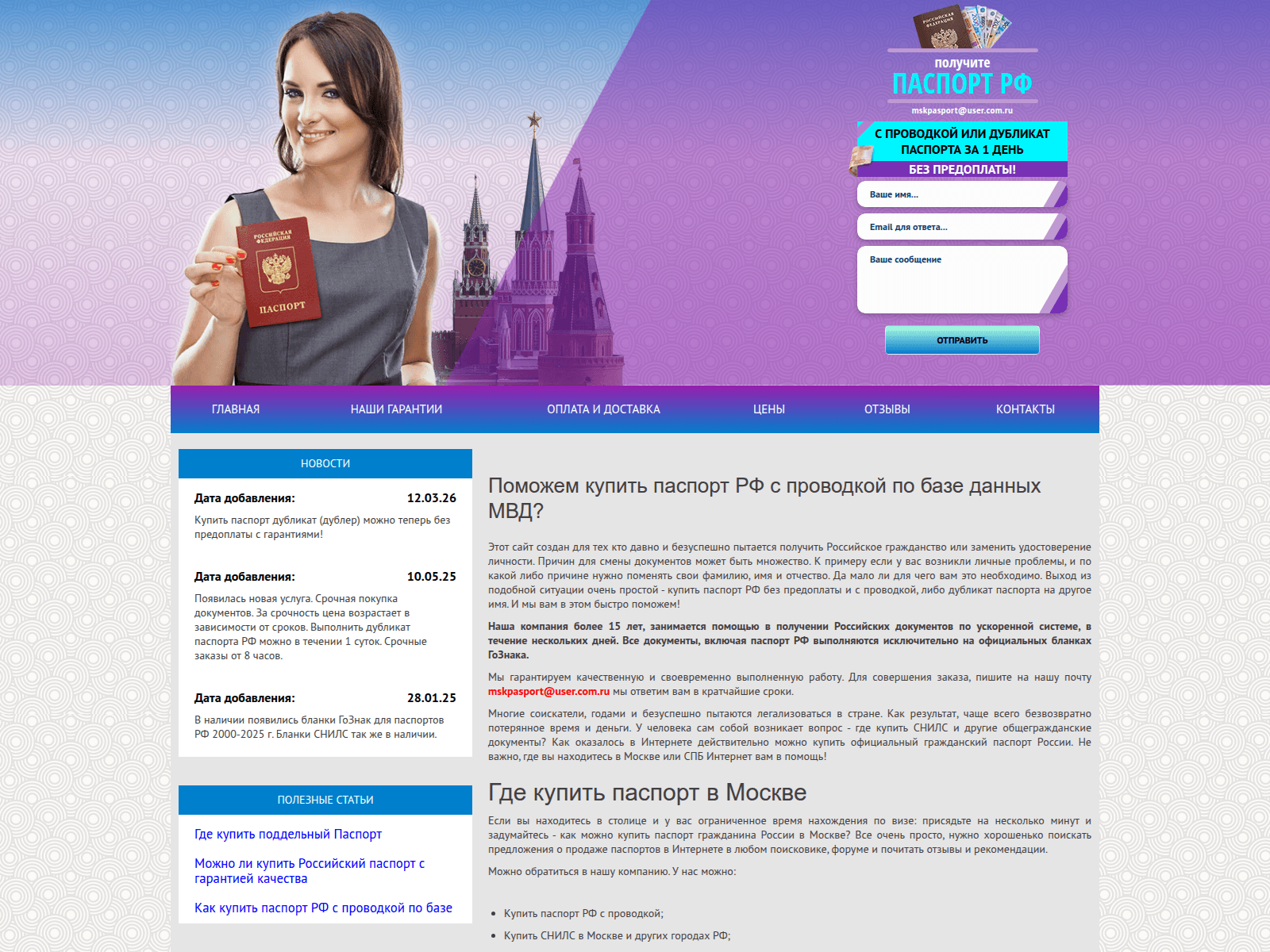 The site displays a page titled “Купить паспорт РФ с проводкой по базе в Москве”.