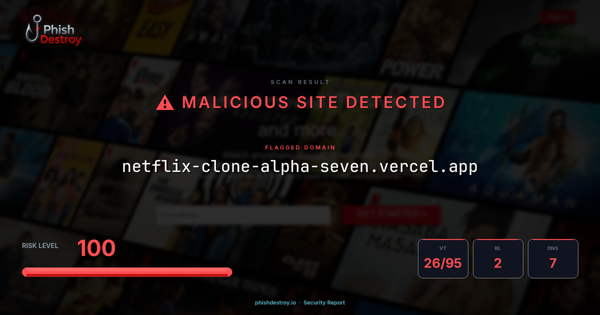 netflix-clone-alpha-seven.vercel.app has been flagged by 26 security vendors as of March 16, 2026.
