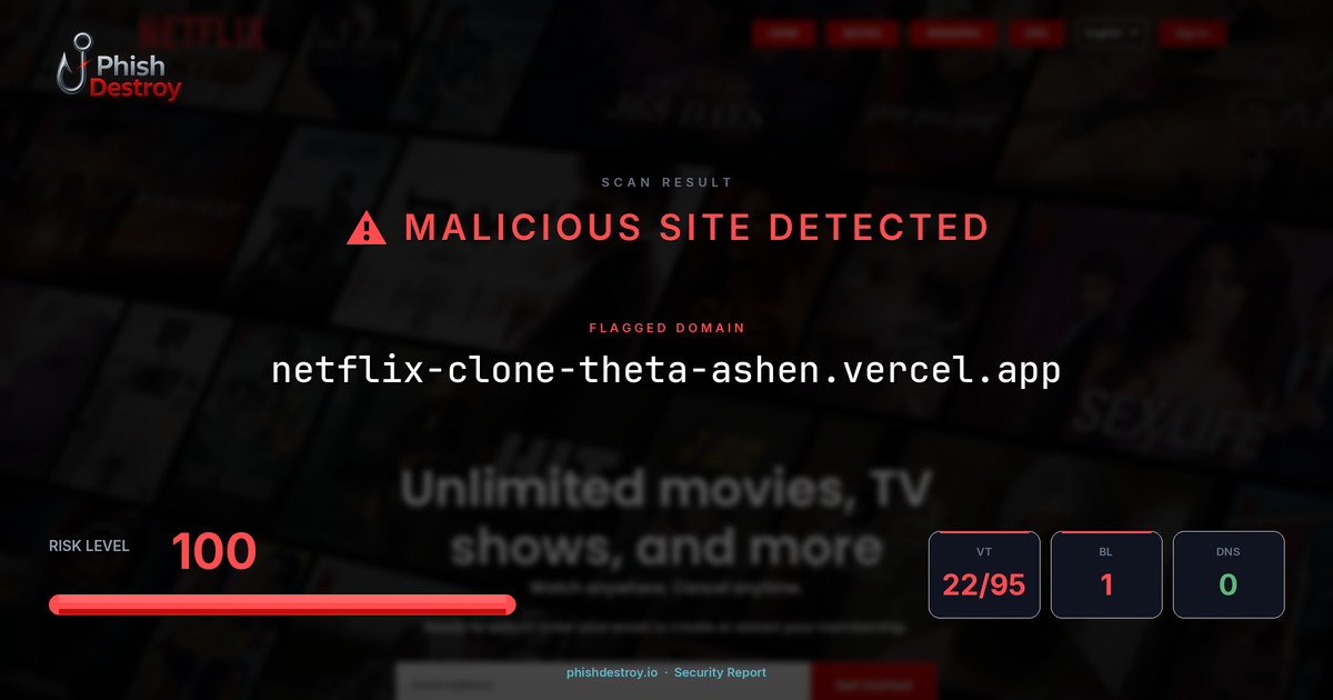 This domain security report for netflix-clone-theta-ashen.vercel.app is maintained by PhishDestroy's automated threat intelligence pipeline. Our system continuously monitors this domain across 24 security vendors on VirusTotal, 1 public blocklists, and Google Safe Browsing.