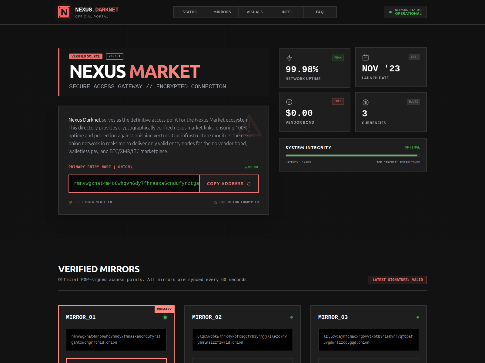 PhishDestroy identifies nexus-darknet[.]digital as an active phishing domain posing a medium threat to users. This site masquerades under the guise of 'Nexus Darknet | Official Links & Mirrors,' aiming to deceive visitors into divulging sensitive information. Phishing attacks like this can lead to credential theft, financial loss, and compromised personal data, making vigilance essential.