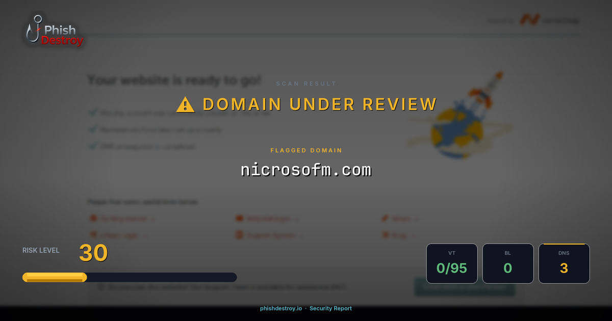 nicrosofm.com has been listed on PhishDestroy as a suspicious domain. Scanned by 95 security vendors — automated detections may take time to update. PhishDestroy threat analysts continue to monitor this domain.