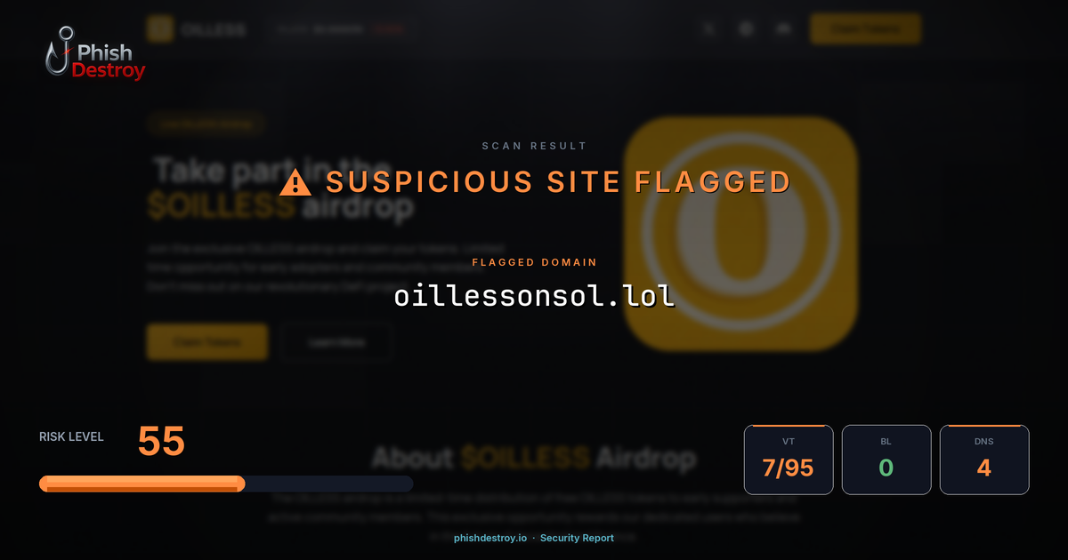 The domain oillessonsol[.]lol has been identified as a cryptocurrency phishing website. This malicious site targets Web3 users by mimicking legitimate crypto platforms to steal wallet credentials and digital assets.