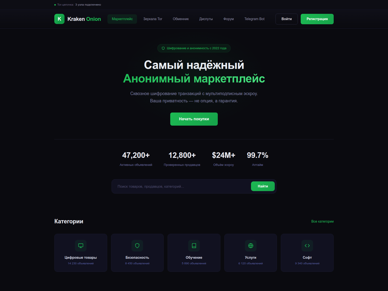 The site displays a page titled “KRAKEN - ЗЕРКАЛО ONION”, which may be designed to impersonate Kraken.