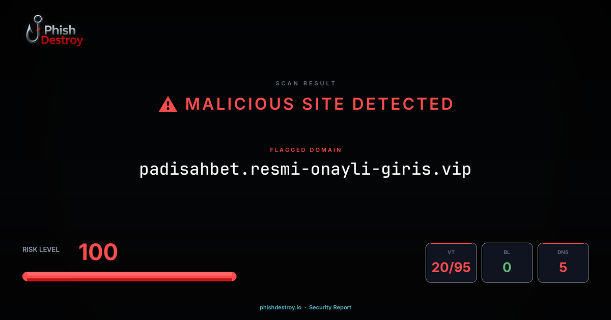 padisahbet.resmi-onayli-giris.vip has been flagged by 20 security vendors as of March 16, 2026.