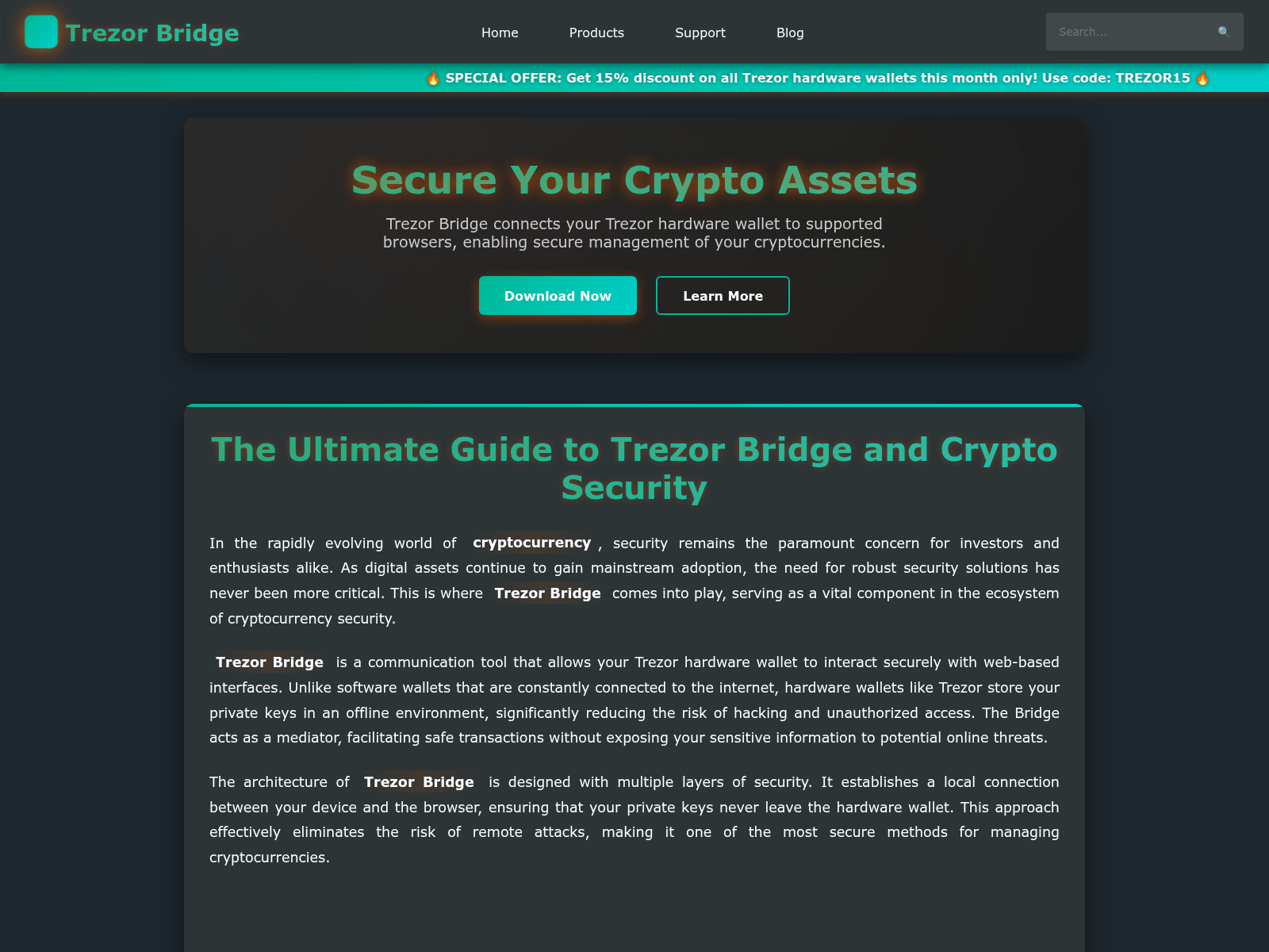The site displays a page titled “Trezor Bridge - Secure Your Crypto Assets”, which may be designed to impersonate Trezor.