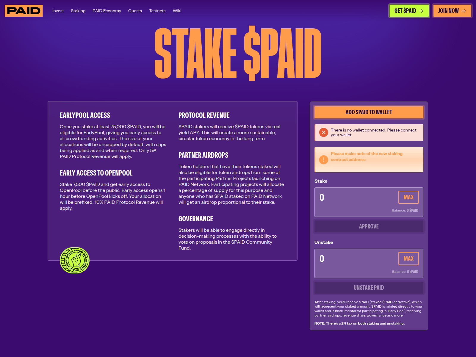The site displays a page titled “Staking - PAID”.