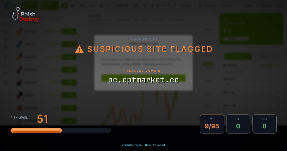 The domain pc[.]cptmarket[.]cc has been identified as a cryptocurrency phishing website. This malicious site targets Web3 users by mimicking legitimate crypto platforms to steal wallet credentials and digital assets.