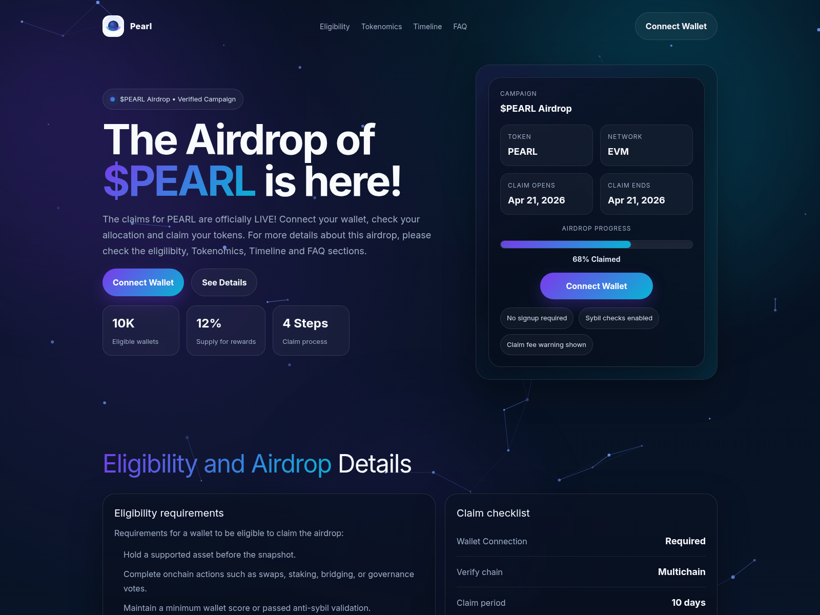 The site displays a page titled “$PEARL Airdrop”, which may be designed to impersonate Airdrop Scam.