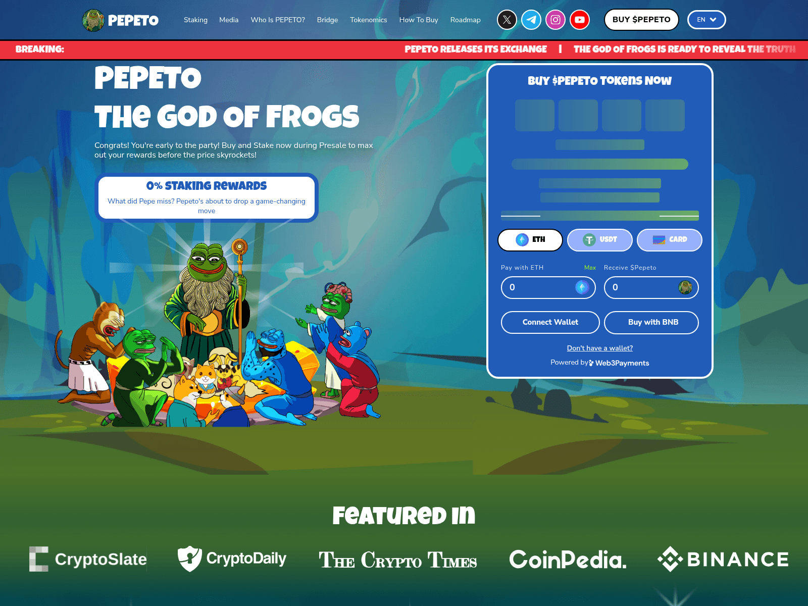 The site displays a page titled “PEPETO Token– The Ultimate Memecoin Revolution | Presale for Multi-Memecoin Exchange”.