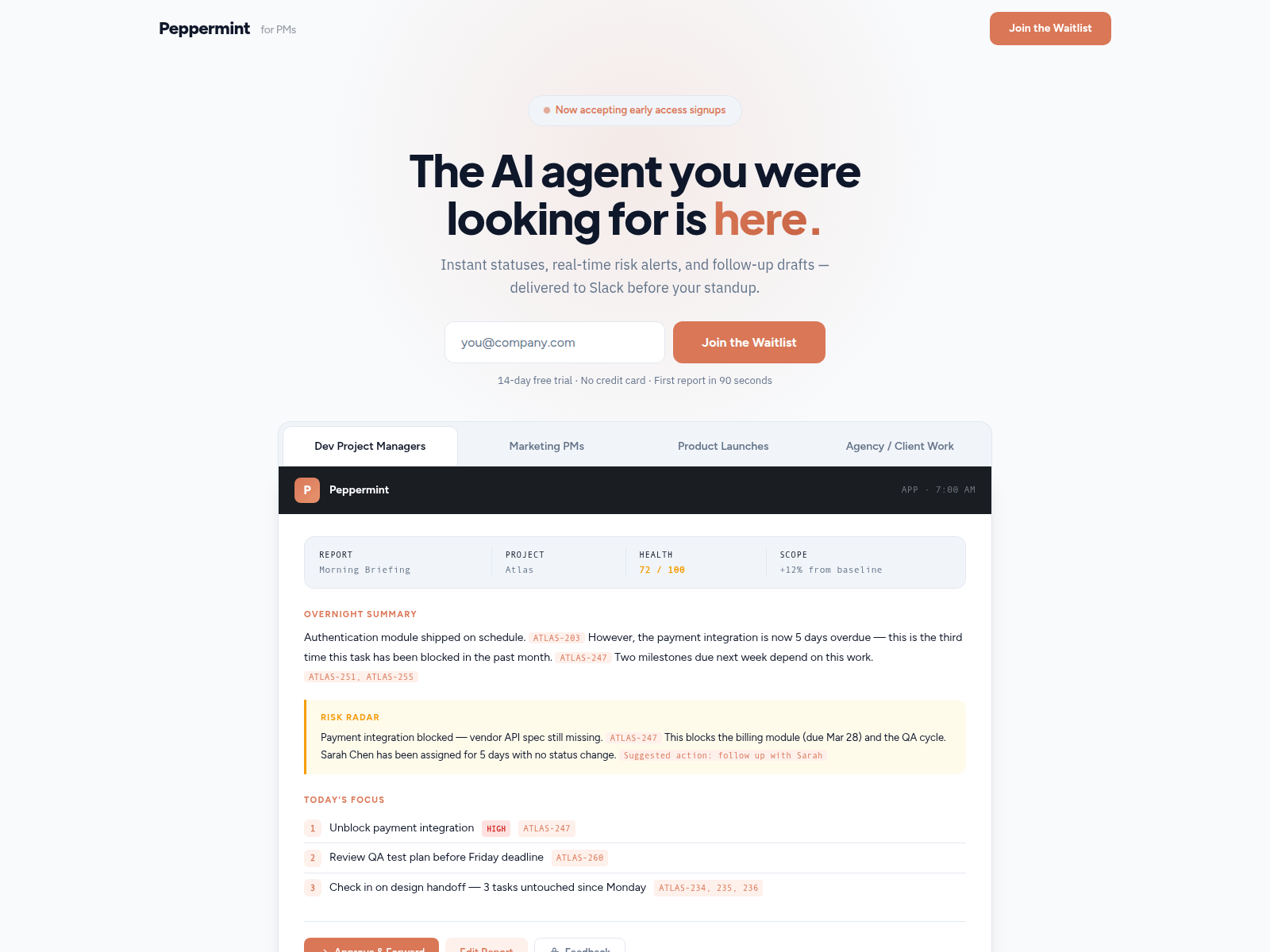 The site displays a page titled “Peppermint â Stop Burning Out on Status Updates”.