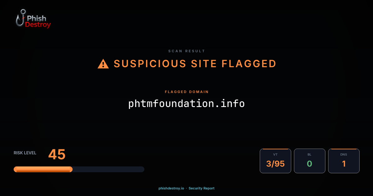 This domain security report for phtmfoundation.info is maintained by PhishDestroy's automated threat intelligence pipeline. Our system continuously monitors this domain across 3 security vendors on VirusTotal, 1 public blocklists, and Google Safe Browsing.