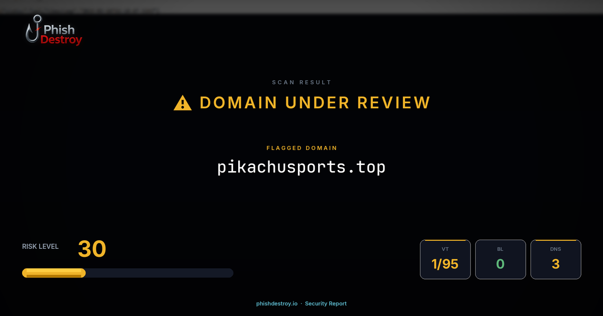 This domain security report for pikachusports.top is maintained by PhishDestroy's automated threat intelligence pipeline. Our system continuously monitors this domain across 1 security vendors on VirusTotal, 1 public blocklists.