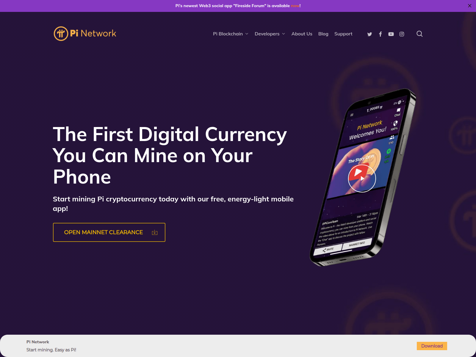 The site displays a page titled “Pi Blockchain, Community & Developer Platform | Pi Network”, which may be designed to impersonate facebook.