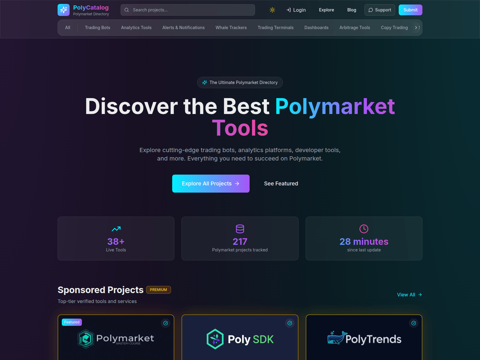 The site displays a page titled “Best Polymarket Tools & Bots Directory 2026 — PolyCatalog (38+ Listed)”.