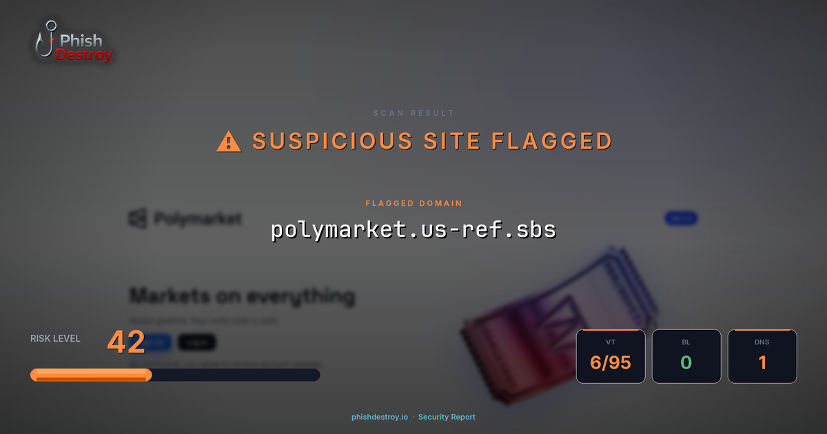 This domain security report for polymarket.us-ref.sbs is maintained by PhishDestroy's automated threat intelligence pipeline. Our system continuously monitors this domain across 6 security vendors on VirusTotal, 1 public blocklists.