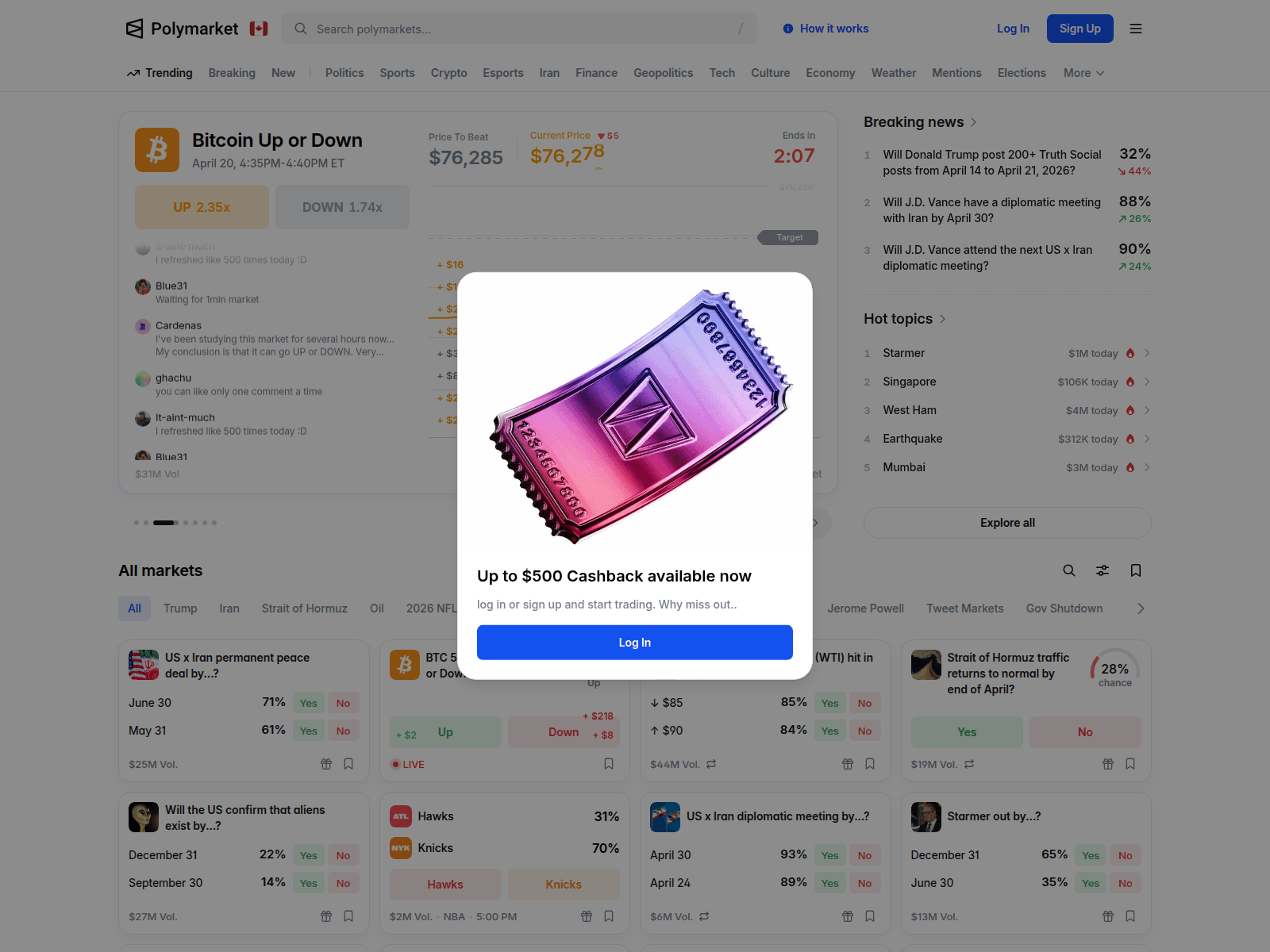The site displays a page titled “Polymarket | The World's Largest Prediction Market™”.