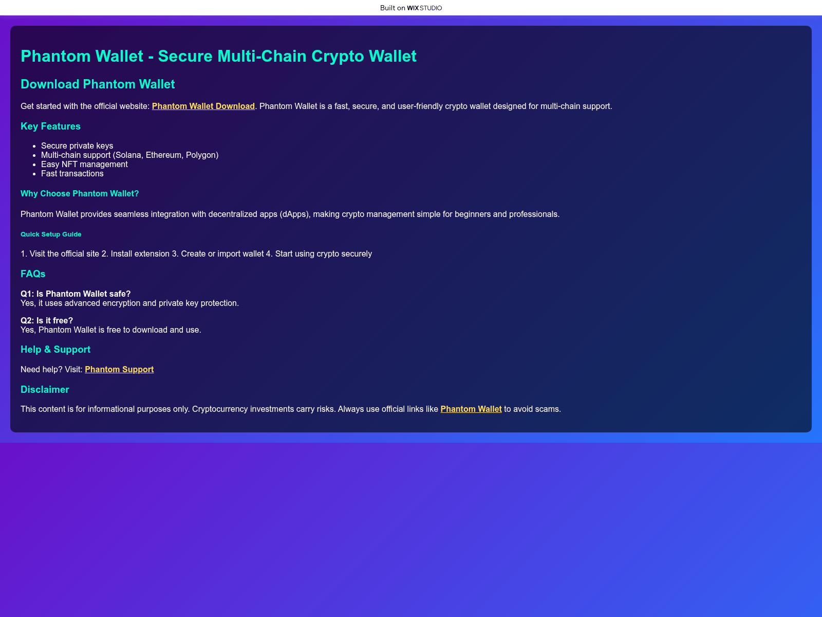 Current status shows the Solana drainer remains operational and actively targeting Phantom wallet users. Given the absence of vendor detection and the domain’s recent setup, the risk of exposure to users remains high. It is strongly recommended to block pphantom[.]wixstudio[.]com at the network and DNS levels immediately. Users should verify wallet URLs manually, avoid clicking links from unsolicited sources, and report any interaction with this domain to their security teams. Security vendors are urged to update detection signatures urgently to prevent further exploitation.
