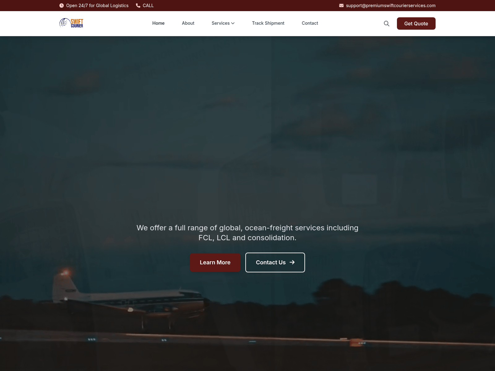 The site displays a page titled “Welcome to Premium Swift Courier Services - Premium Global Shipping Solutions”.