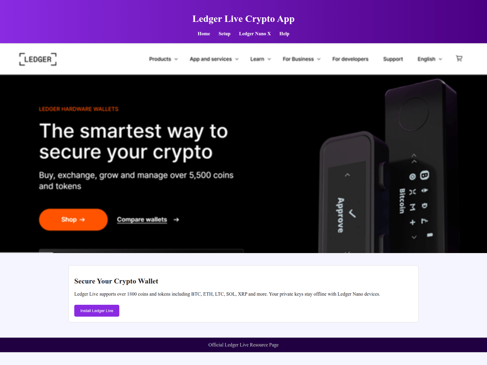 The site displays a page titled “Ledger Live App | Manage Crypto Safely”, which may be designed to impersonate Ledger.