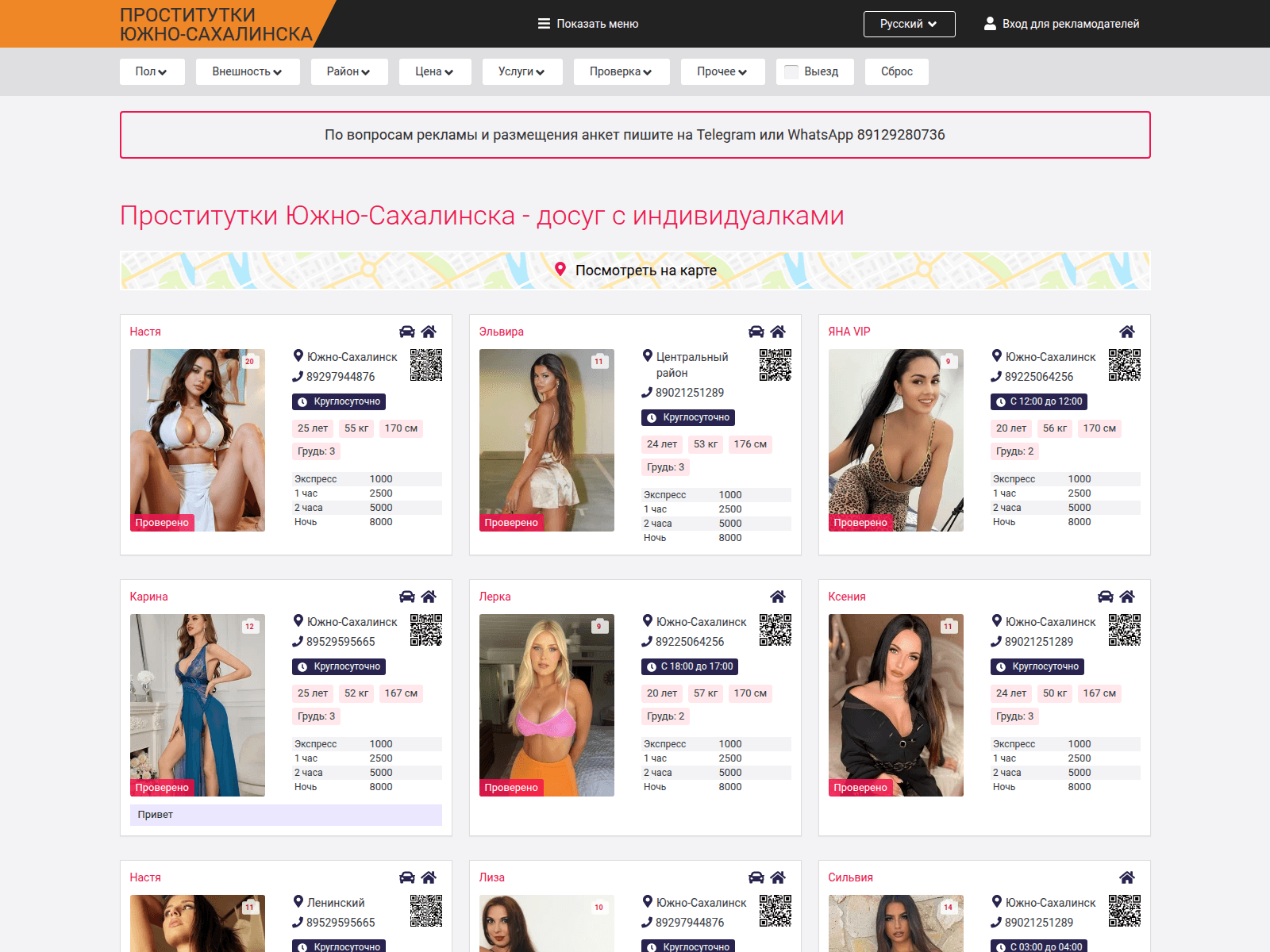 The site displays a page titled “Проститутки Южно Сахалинска - снять индивидуалку на сайте | Заказать шлюх Южно-Сахалинске”.